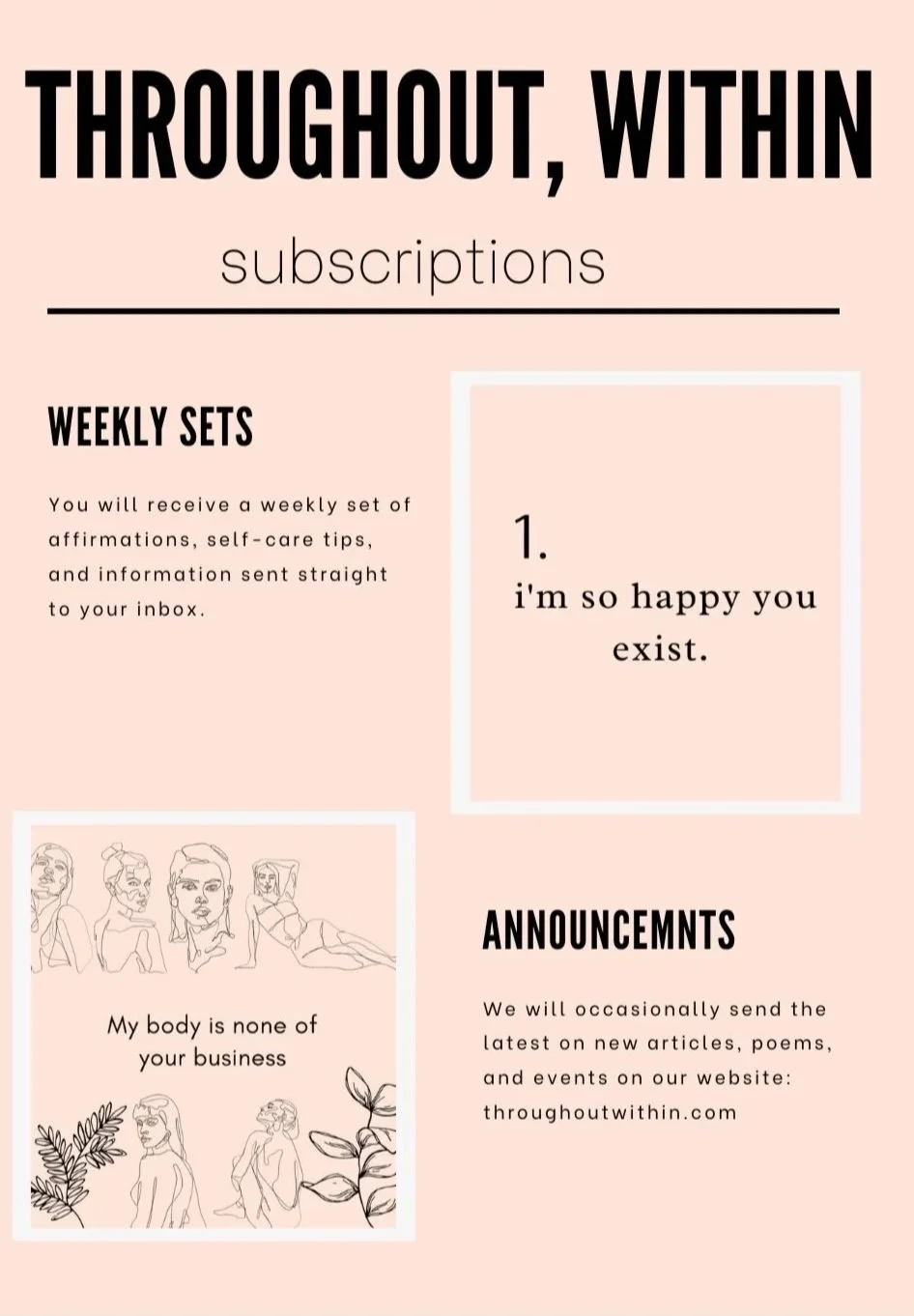 self-care, affirmations, body positivity/neutrality. straight to your inbox. every week. subscribe. WE ARE NO LONGER ACCEPTING NEW SUBCRIPTIONS Name * First Name Last Name Email * Thank you! do it.your body and mind will thank you.